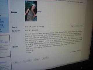 This chick only has 2 friends. Tom and Mazza. She wrote Mazza a nice message begininng... "Hi K.K. Warslut..."