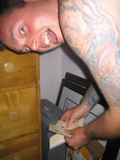 shredding his bank cheques ...... literally.