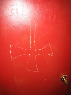 Upside-down cross in the bathroom.
