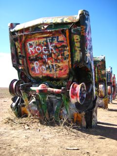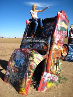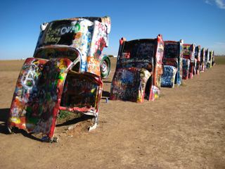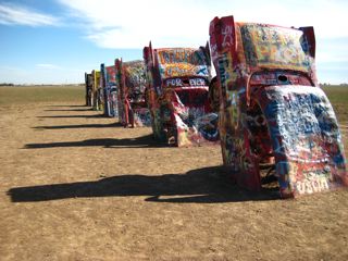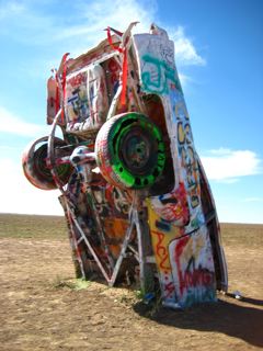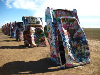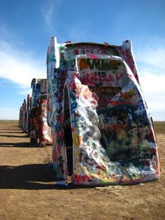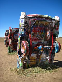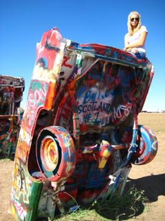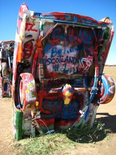 Near Amarillo lies the Cadillac Graveyard..........smack bang in the middle of fields of crops theres about 10 cars on their ends covered in names from all over the world......Its an awsome scene.....nothing around for miles either
