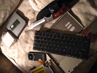His tools were a buck knife and a cell phone..he completely stripped my lap top to the bare wires and somehow things came together....