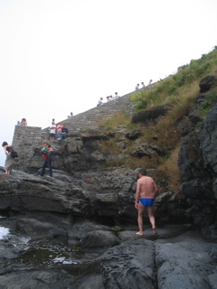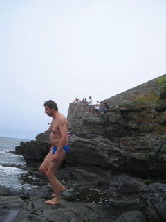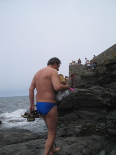So this dude shows up and asks how the water is in a German accent. He was wearing regular shorts and a shirt. We tell him the water is warm so he whips off his shorts to reveal the latest in Donkey Punch merchandise.