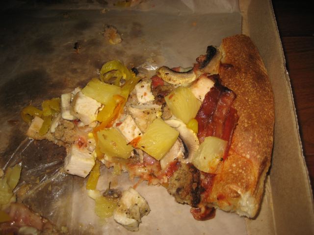 Mazzas pizza. Chicken, Bacon, pineaple, mushrooms and hot peppers.