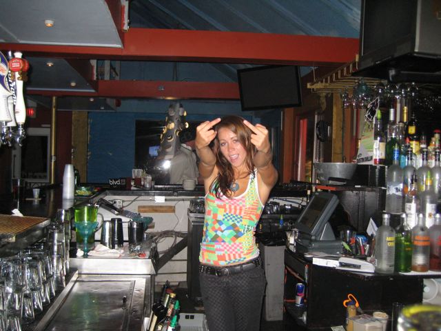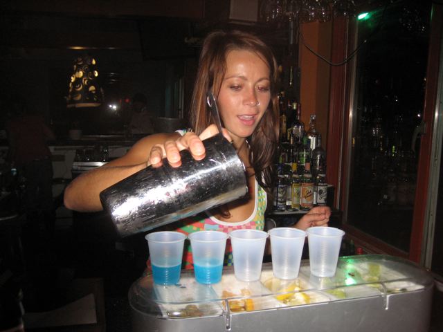 Katie tends bar.