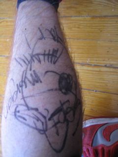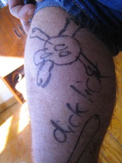oki. so got mangled from my spanish party jug and woke up in the same party with my legs all skribbled on. it wasnt even any thing epic like a dick or balls or a swastika. it was like really gay arty sketches on my calves......
