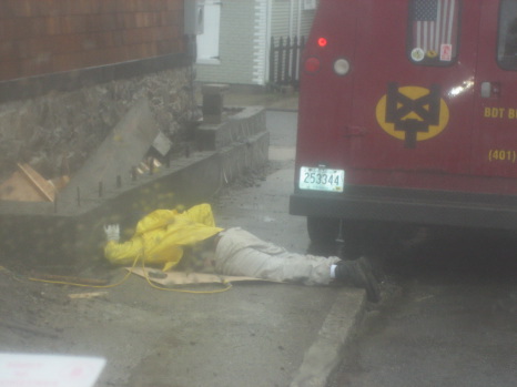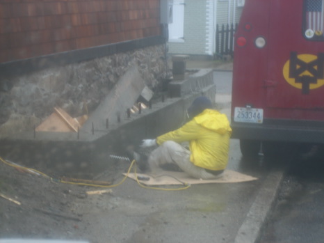 Here he's drilling holes in concrete in the pissing rain wearing only a belly shirt style raincoat as protection from the elements. It looked like it sucked from my warm truck. I would have got out and helped but I was busy drinking a coffee.