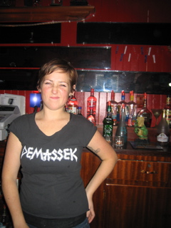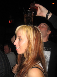 Sara has all sorts of bar tricks. She can carry drinks on her head. A cheers wont even knock it off. I tried it and my beer fell and hit her in the head then smashed the drink in her hand. Sorry.
