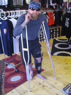 Fred Smith went to some reunion bowl jam the other day and mangled his knee causing his leg and foot to turn black.