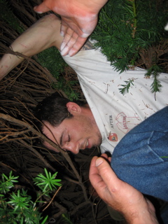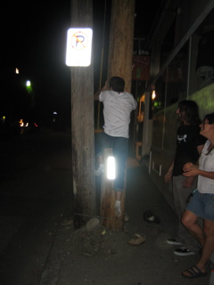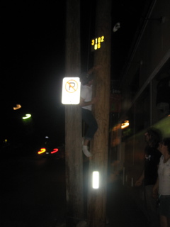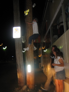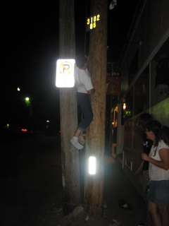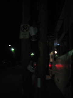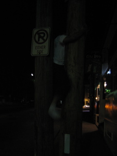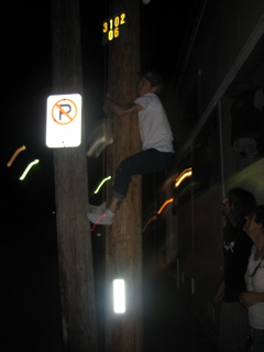Ricky was trying to fit in between these two poles. The only spot to fit through was like 15 feet up and he couldnt make it with his shoes on.