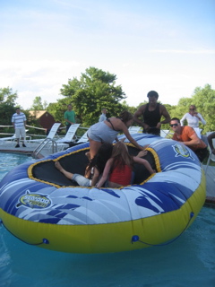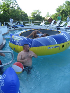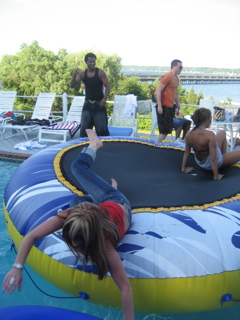 The birds were scrambling to get off the trampoline...everyone ended up in the pool .....so many cell phones got mangled