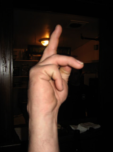 Pete Booth giving a bro-call / drink.