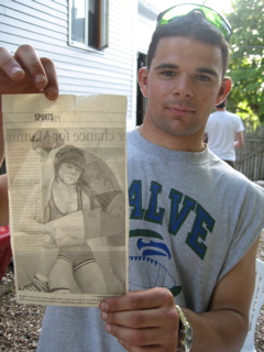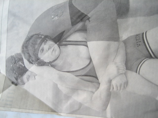 Hes been murdering other laddies in high school wrestling.......here he shows me a photo from the newspaper of him pulling the leg off some kid