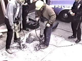 This is bonkers......some poor sod got cemented face down on the side walk....while some workies chipped him out.