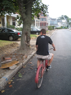 Logan on his lobster bike. My street is like fucking Calcutta right now. Except they don't have Camaros in Calcutta.