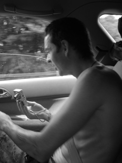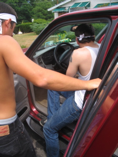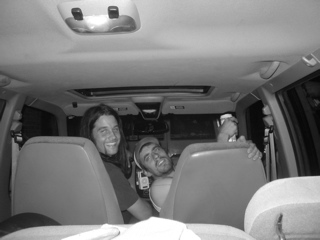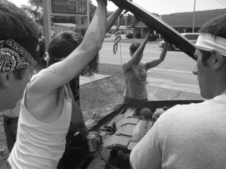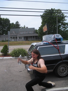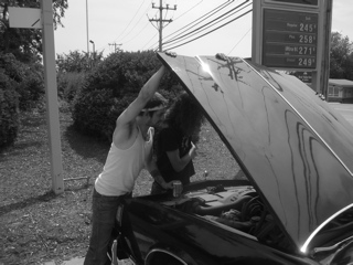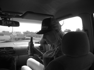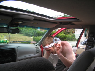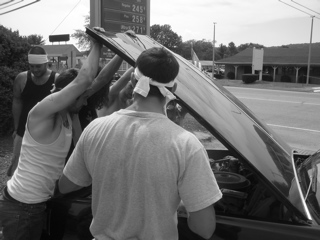 We pulled over at a gas station for gas and air and snacks. Jon was fixing some fuses in the banana mobile so they could listen to Jons ipod. He found some birth control in Lander's car! The alien wasd gonna try and sell them.