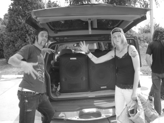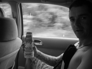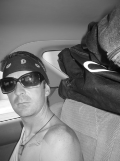 Jon squashed up in the back of the banana mobile drinking a beer.